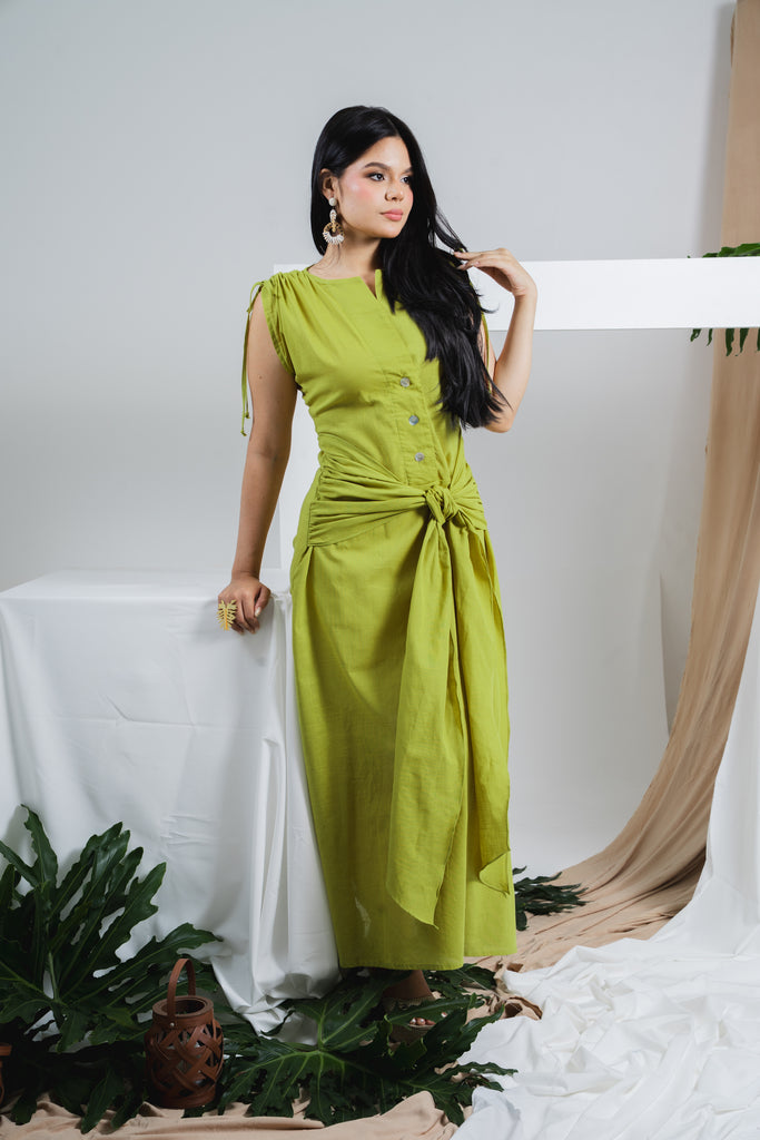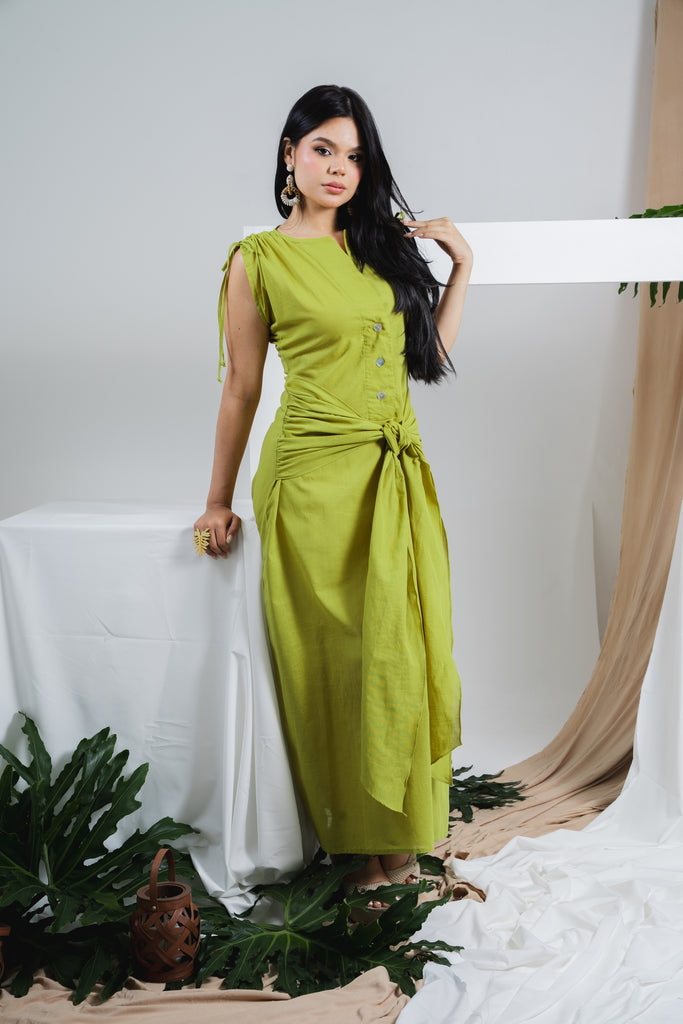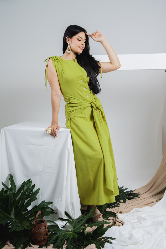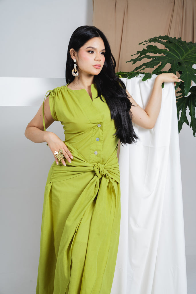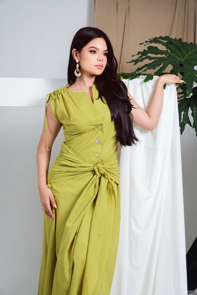 El Vestido Thalia está confeccionado en lino, un tejido fresco y natural que aporta estructura y suavidad al diseño. Su silueta larga y estilizada se complementa con un delicado fruncido en la cintura que realza la figura de manera sutil, mientras que el amarre frontal genera un efecto envolvente que añade movimiento y un toque moderno. Los hombros ajustables con delicados moños permiten personalizar el calce y aportan un aire femenino y relajado. Los botones frontales armonizan el diseño y completan una pieza versátil, sofisticada y perfecta para ocasiones especiales o días elegantes de verano.