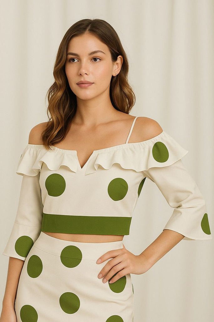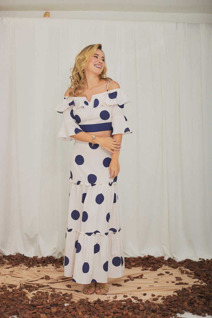 Blusa Point está elaborada en poliéster Spandex, una mezcla que se adapta cómodamente al cuerpo y realza la silueta. Su diseño estampado en lunares grandes le da un aire divertido y sofisticado, mientras que los hombros descubiertos con volantes aportan un toque femenino y encantador. Perfecta para un look vibrante y moderno.