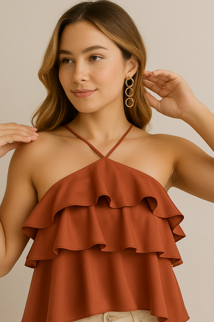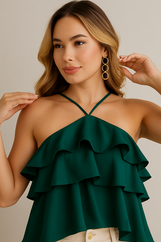 Blusa Marea, explosión de movimiento y elegancia. Confeccionada en seda liviana, esta prenda resalta por sus capas de volantes fluidos y su tirante delgado cruzado al cuello que enmarca delicadamente los hombros. Ideal para ocasiones especiales o para elevar un look casual con un toque sofisticado.