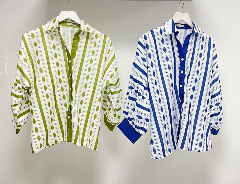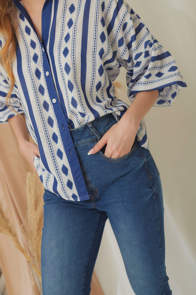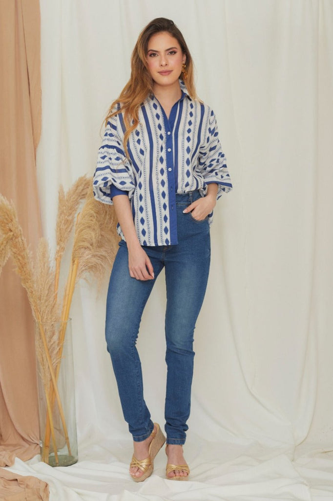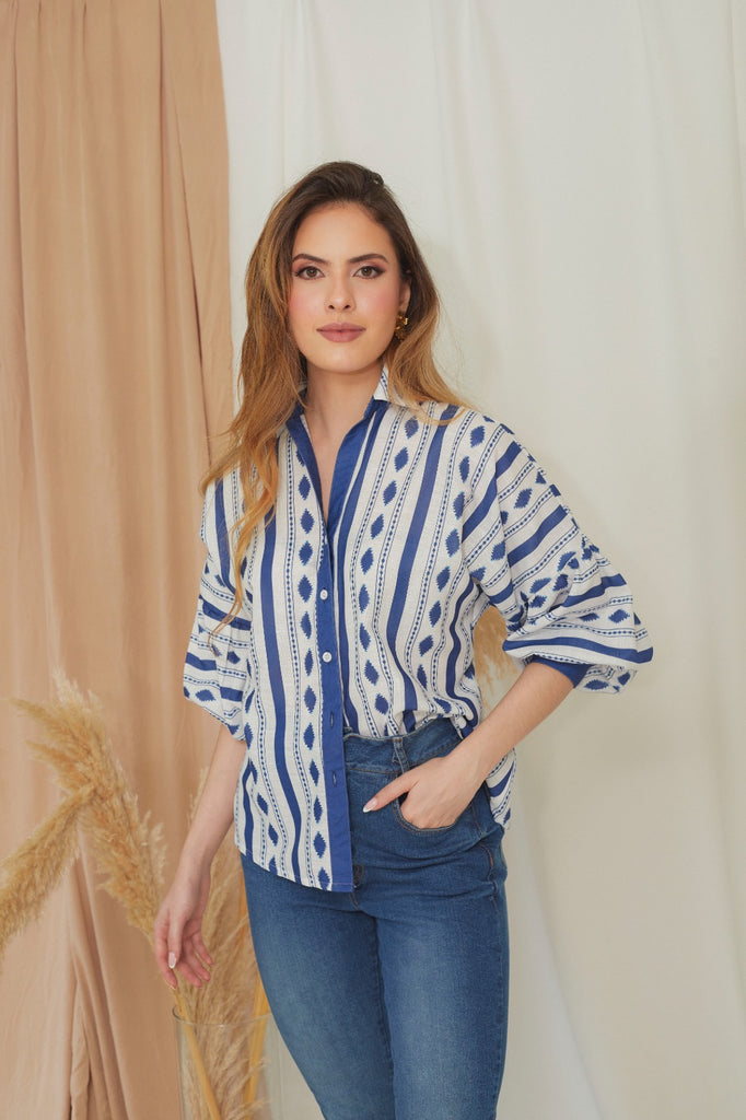 Blusa elaborada en lino, es una prenda fresca y cómoda con un diseño sofisticado. Su estampado geométrico de figuras y líneas aporta dinamismo y modernidad, ideal para quienes buscan un look versátil. Las mangas tres cuartos con ligero volumen agregan elegancia, mientras que su silueta suelta brinda comodidad y fluidez en el movimiento. Perfecta para combinar con jeans o pantalones de vestir, adaptándose a diferentes ocasiones.