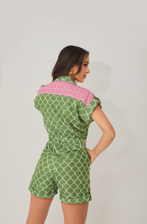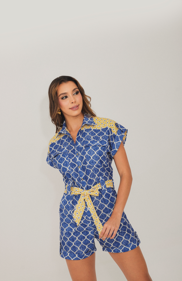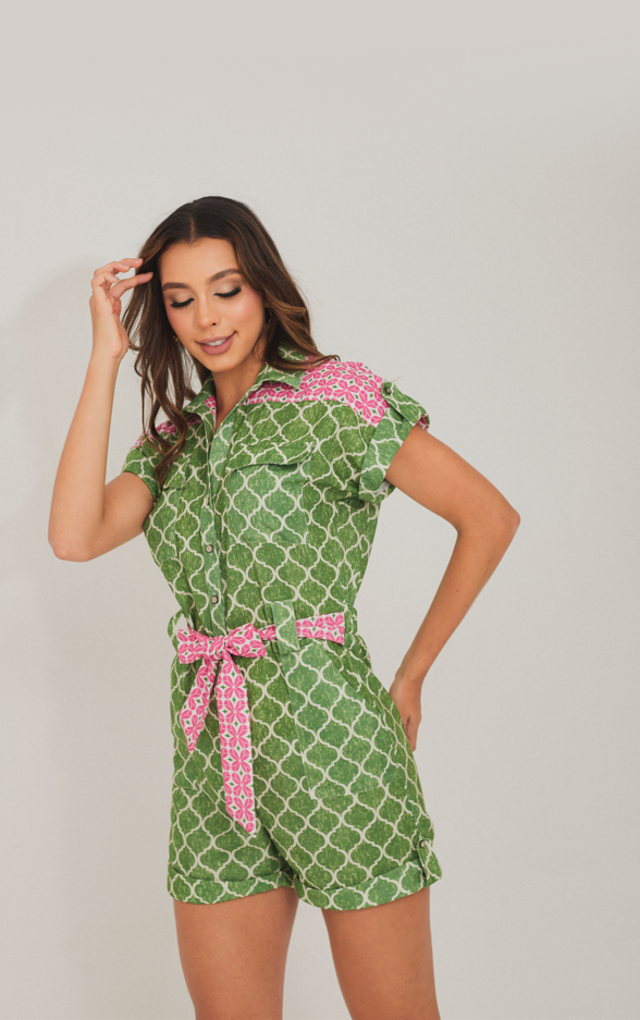 Disfruta del verano con estilo y elegancia con nuestro Enterizo Escarlata. Confeccionado en lino con un estampado de cobertura total, su cuello camisero y media perilla de botones son perfectos para un look sofisticado. Además, su cinturón ajustable en tela contrastante realza tu figura. ¡Un must-have en tu guardarropa, crea looks de verano con estilo y comodidad!