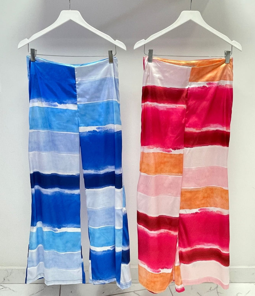 Pantalón elaborado en seda de alta calidad, destaca por su caída fluida y su textura suave al tacto. Su diseño de pierna ancha aporta movimiento y elegancia, mientras que su tiro alto estiliza la figura y define la cintura. El estampado abstracto en degradé evoca frescura y modernidad, convirtiéndolo en la prenda ideal para eventos sofisticados o looks casuales con un toque refinado.