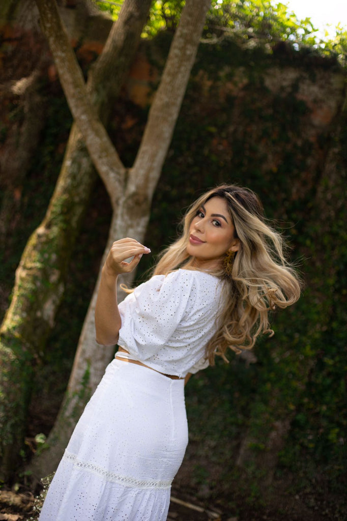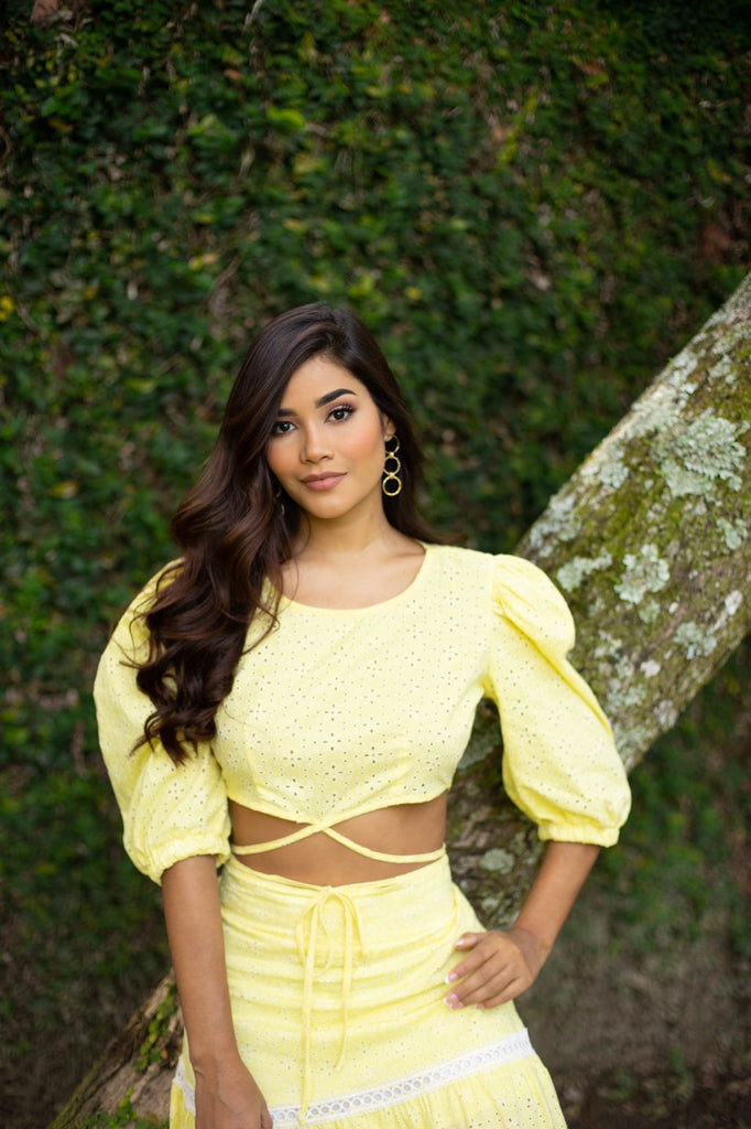 Crop elaborado en Ojalillo, cuello redondo, manga ancha con detalles en pliegues que le brindan un poco de volumen a la pieza y elastico en el puño, diseño con tiras largas en la parte inferior delantera de la prenda elaboradas en la misma tela para ajustar y anudar a la altura y preferencia, cierre trasero.