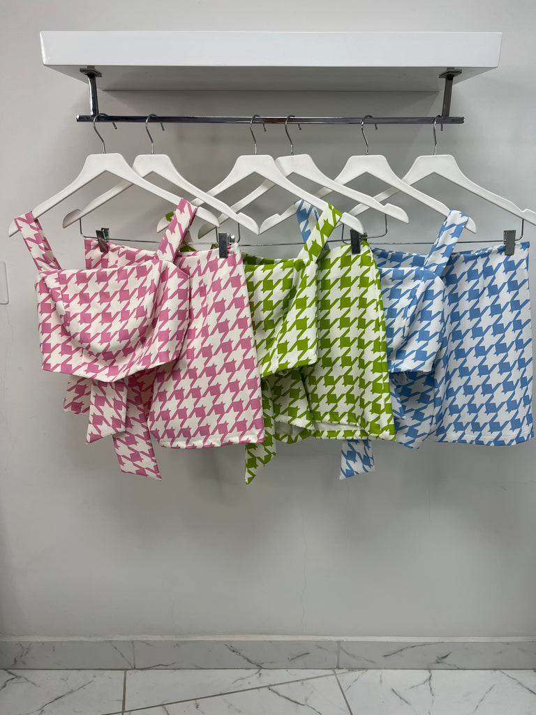 Nuestro croptop Praga presenta un estampado de houndstooth o pata de gallo, con escote recto y tirantes gruesos. Las pinzas delanteras resaltan la figura, mientras que la espalda cuenta con dos tirantes gruesos para un nudo elegante y un ajuste ajustable.