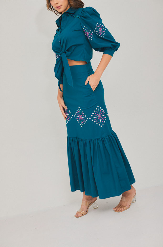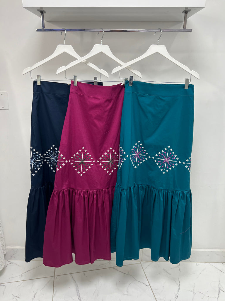 Experimenta la máxima comodidad y estilo con la Falda Bohemia. Está confeccionada con algodón de alta calidad y presenta hermosos detalles bordados. Con cintura alta y prácticos bolsillos laterales, también tiene un cierre invisible en la parte posterior y un corte fruncido hasta la rodilla que permite un movimiento fácil y fluido.