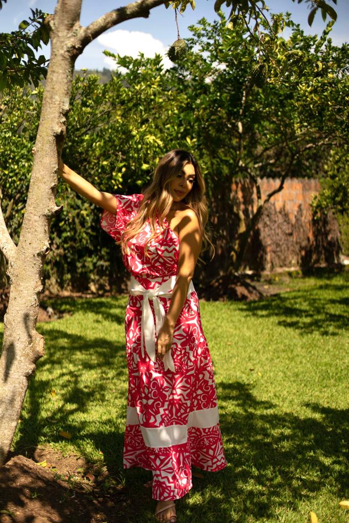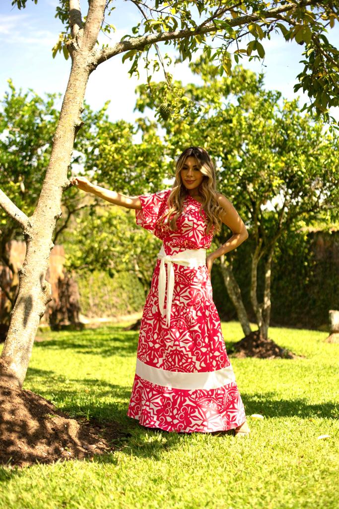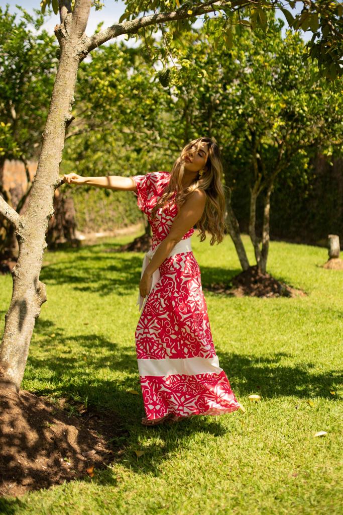 Falda elaborada en Crepé liso con estampado exclusivo de la marca con cortes fruncidos y fajín en blanco que hace contraste, silueta amplia, cierre trasero, trae cinturón blanco